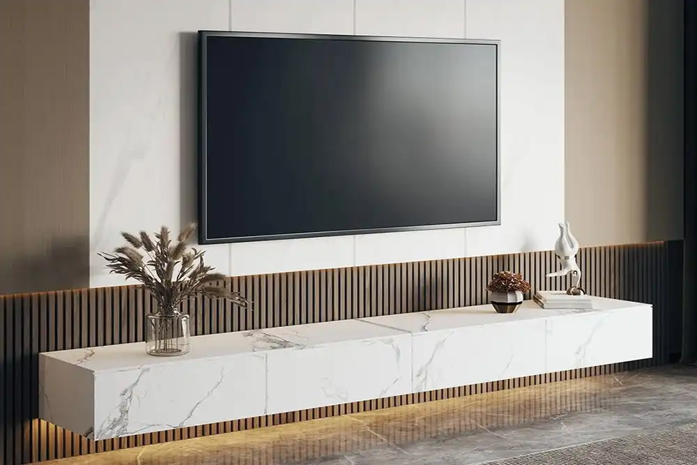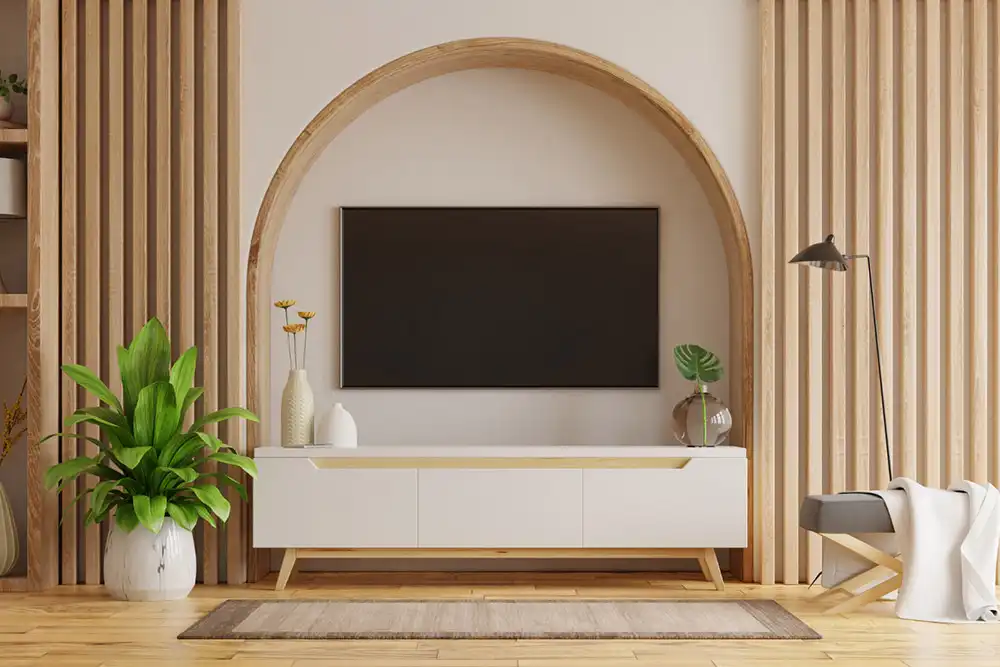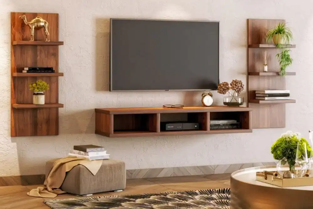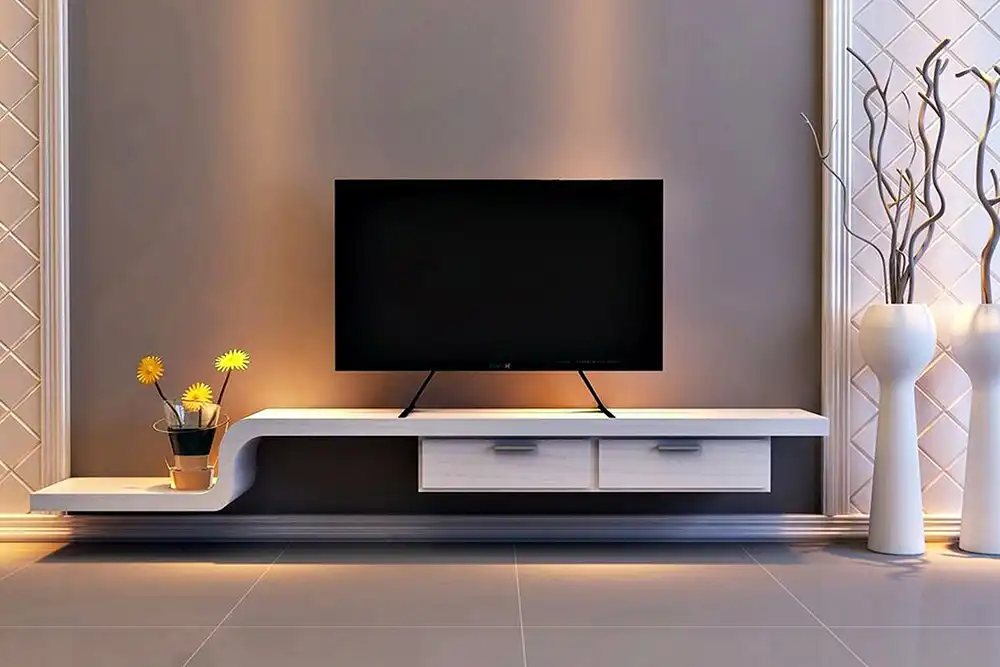 Enhance your living space with a wall-mounted TV unit from M.A Blinds and Curtains. Designed for homes in Kerala, this unit saves floor space while offering a sleek, modern look. Crafted with premium materials, it provides secure mounting and integrated storage solutions. Perfect for minimalistic and contemporary interiors, this design adds elegance and functionality. With our customer-first service, we bring samples and design ideas to your doorstep, ensuring the perfect fit for your home. Choose M.A for wall-mounted TV units that combine style and practicality.