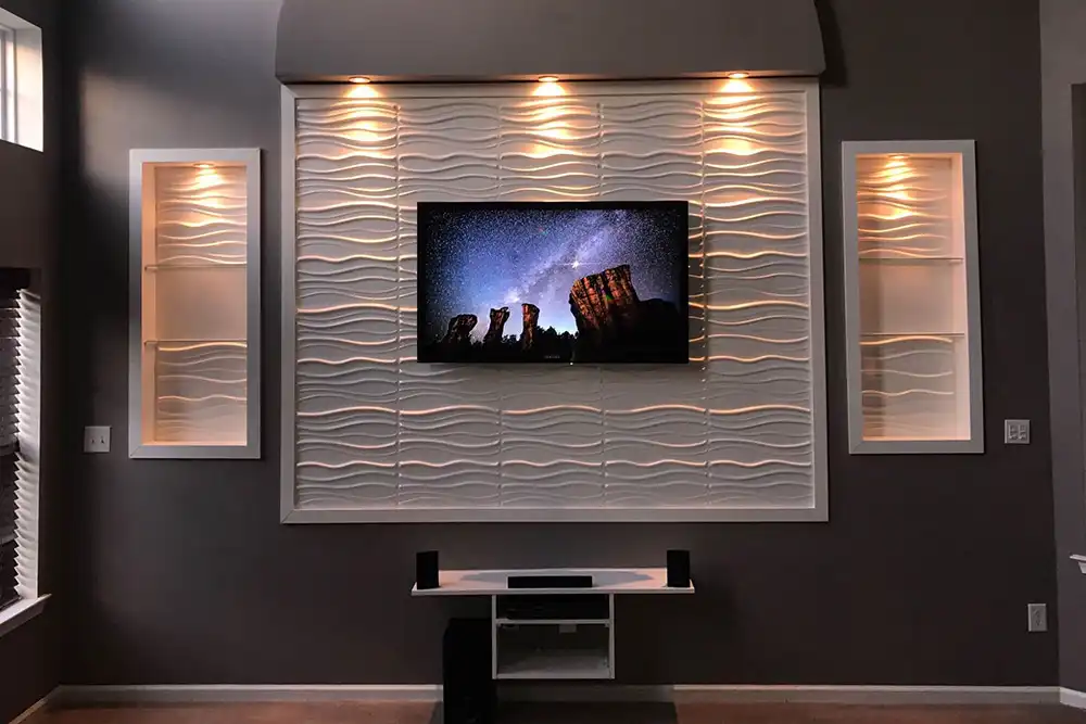 Add ambiance and style with a TV panel featuring LED lighting from M.A Blinds and Curtains. Perfect for homes and entertainment spaces across Kerala, this design integrates soft lighting that highlights your media setup and creates a sophisticated atmosphere. Crafted with premium materials and customizable finishes, it blends aesthetics with practicality. Our customer-first approach brings samples and design ideas directly to your doorstep, making selection easy and personalized. Trust M.A for LED-lit TV panels that transform your entertainment area into a stylish focal point.